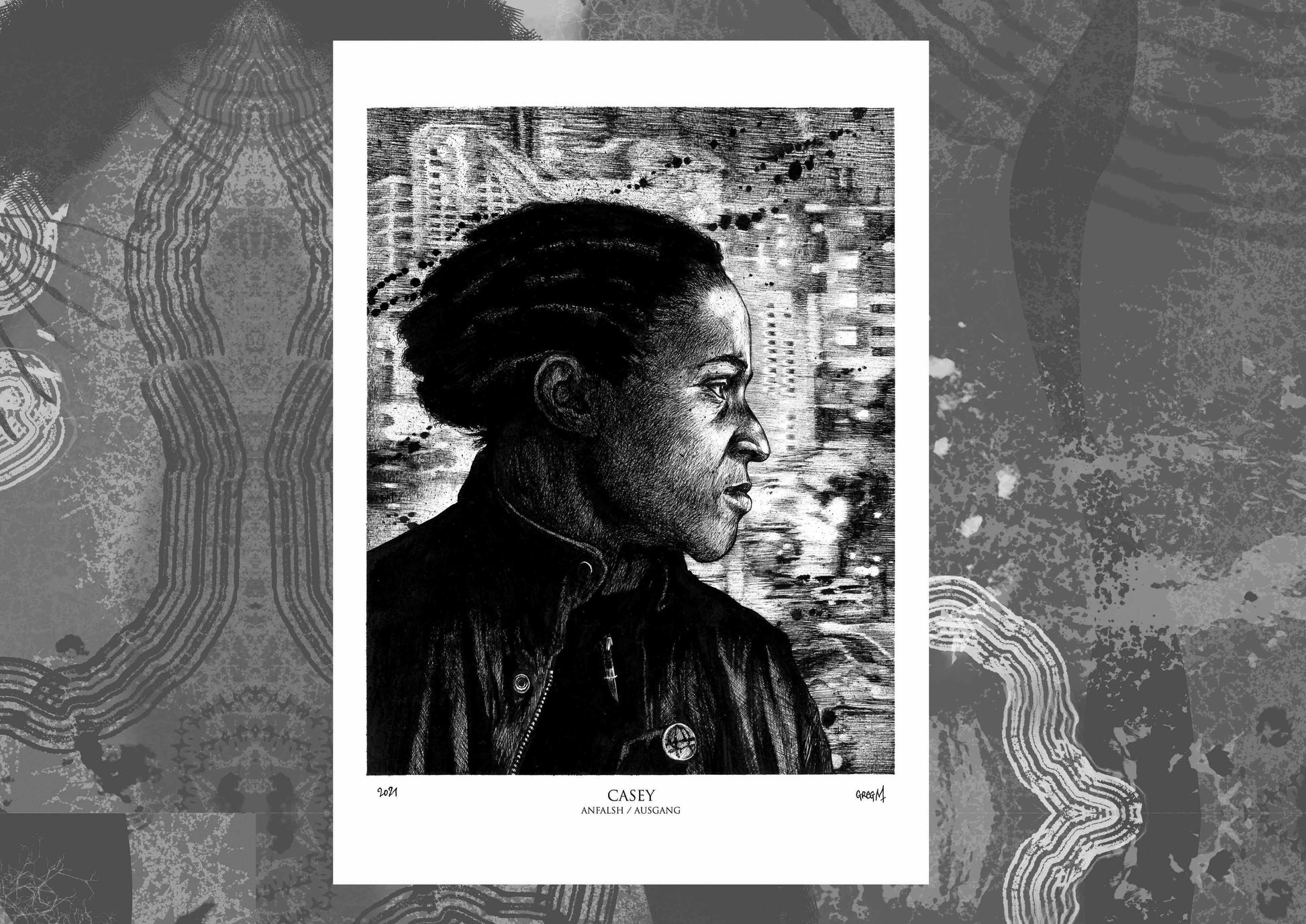 Porträts in monochromer/schwarzer Risografie auf Munken Rough Polar 300 g/A4-Papier gedruckt.