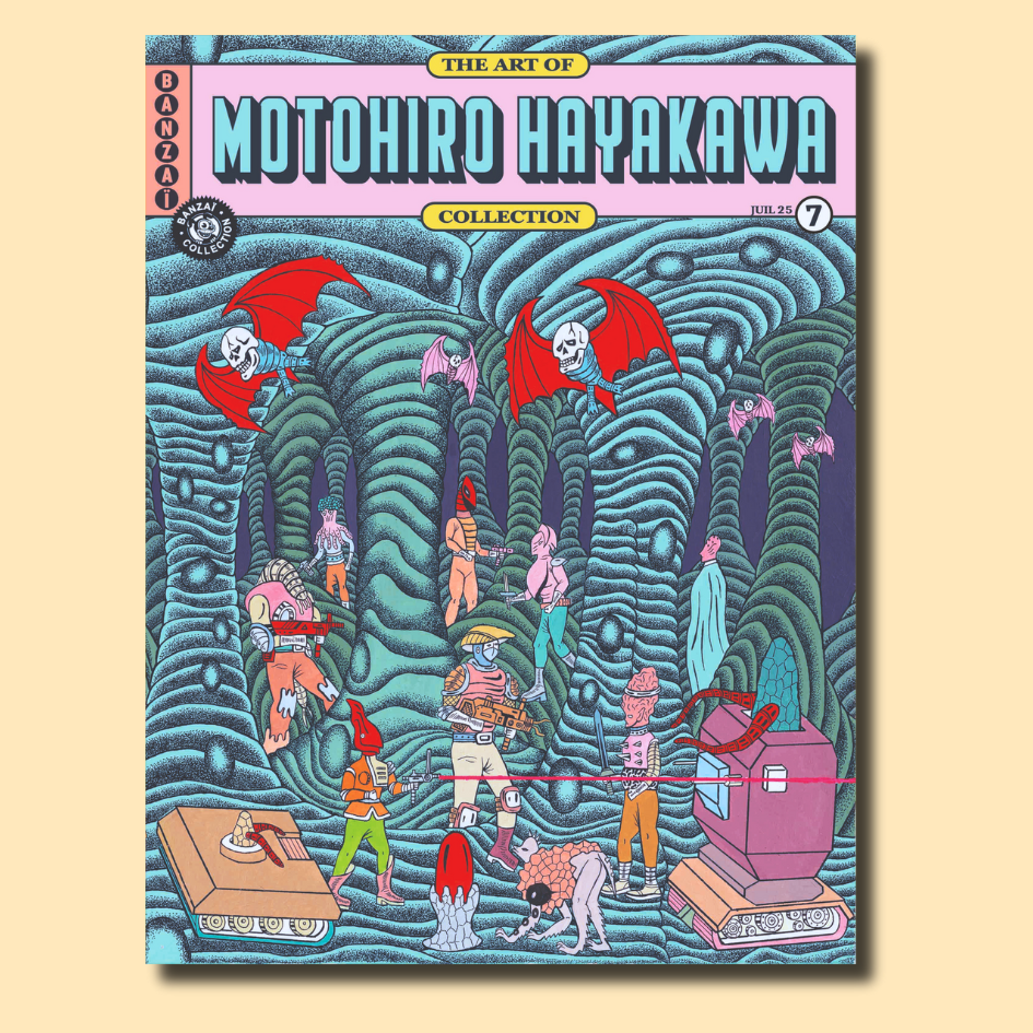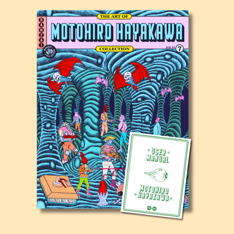 Motohiro Hayakawa has developed a rich and vibrant style, filled with bold lines and bright colors, where giant robots, mutant monsters, futuristic soldiers, masked heroes, and alien factions all collide. His universe pays clear tribute to vintage Japanese toys, soft vinyl kaiju figures, and iconic tokusatsu series such as Super Sentai or Kamen Rider — better known in the West as Power Rangers. A formal freedom inspired by the heta-uma movement.