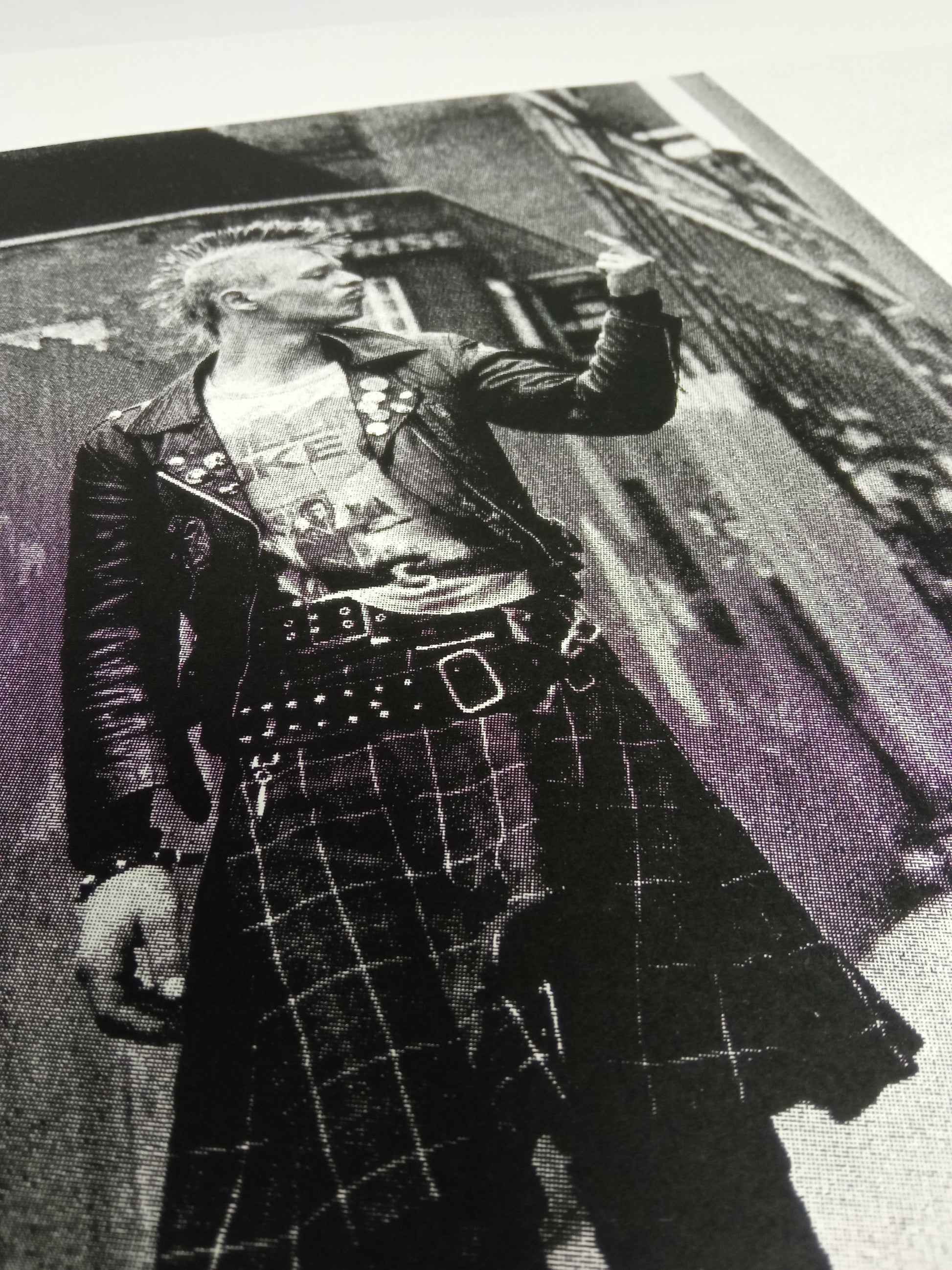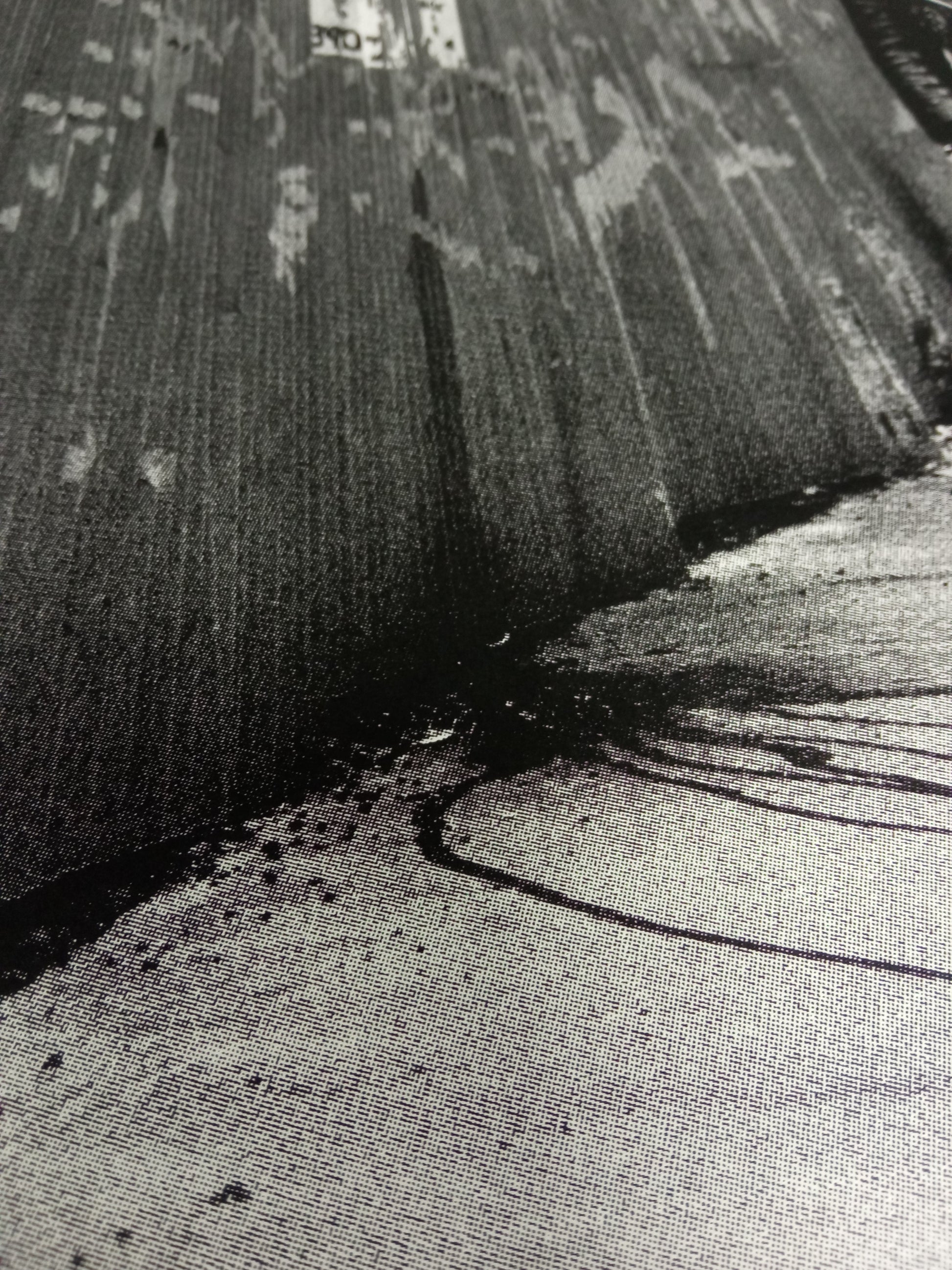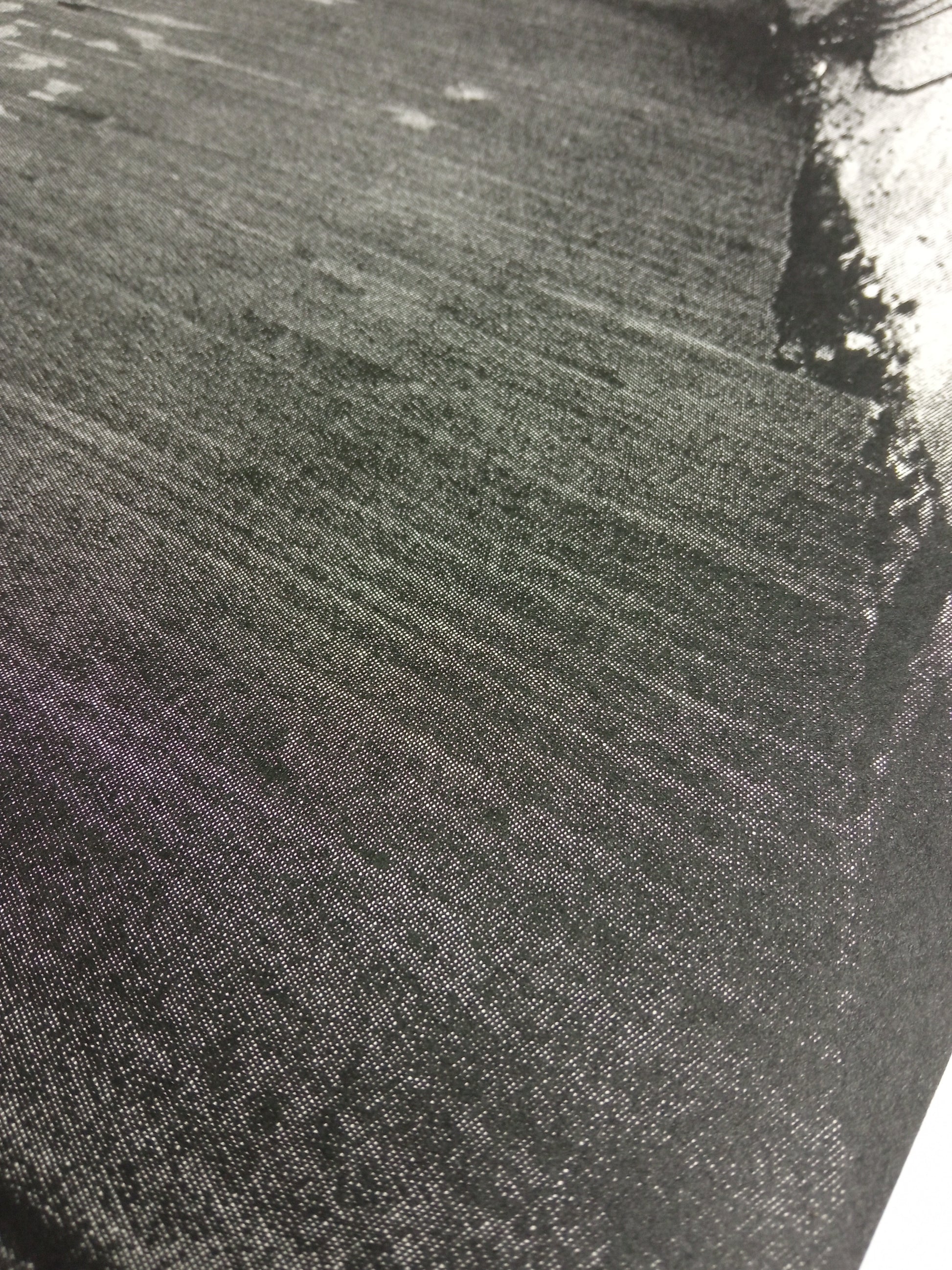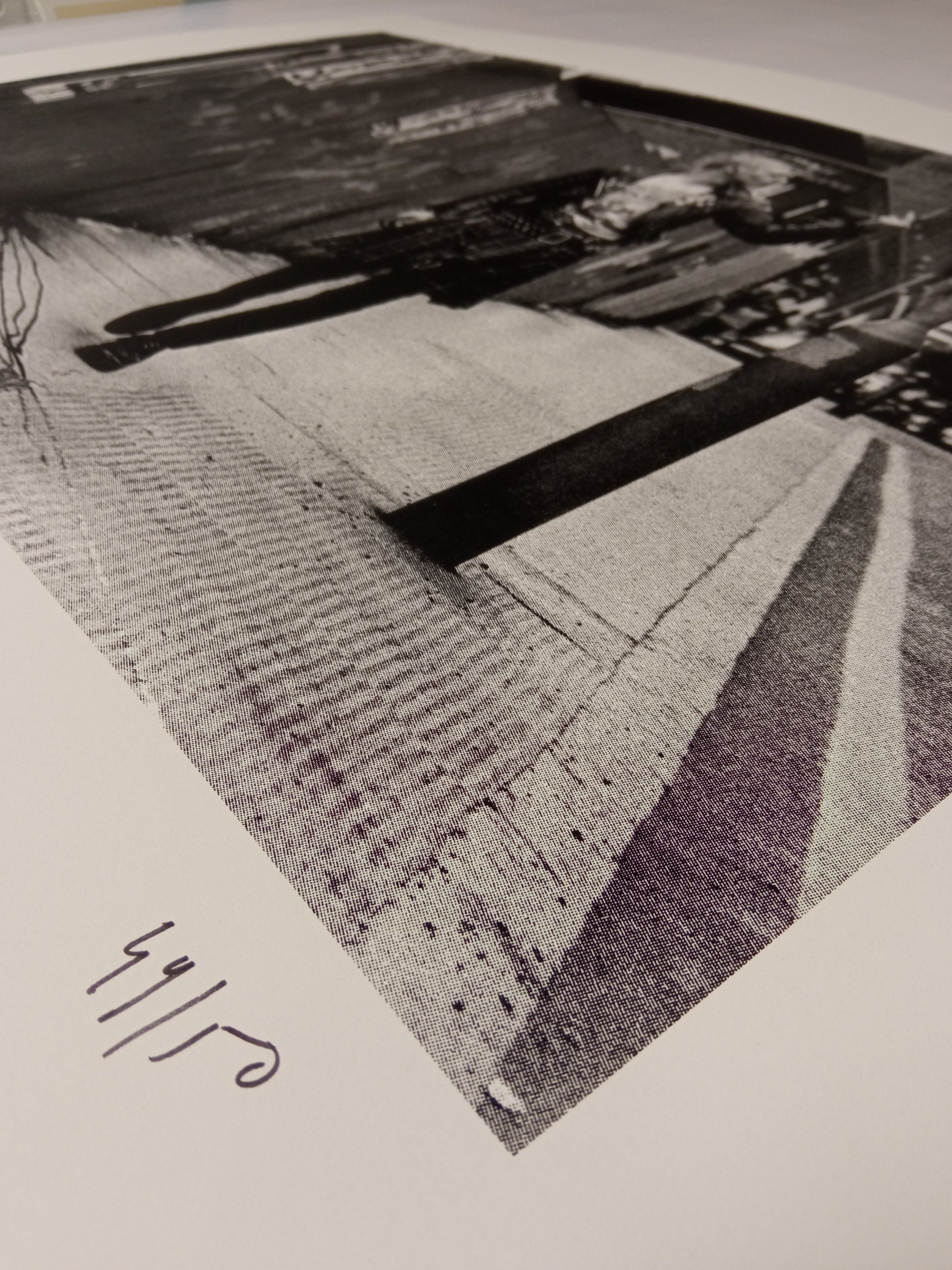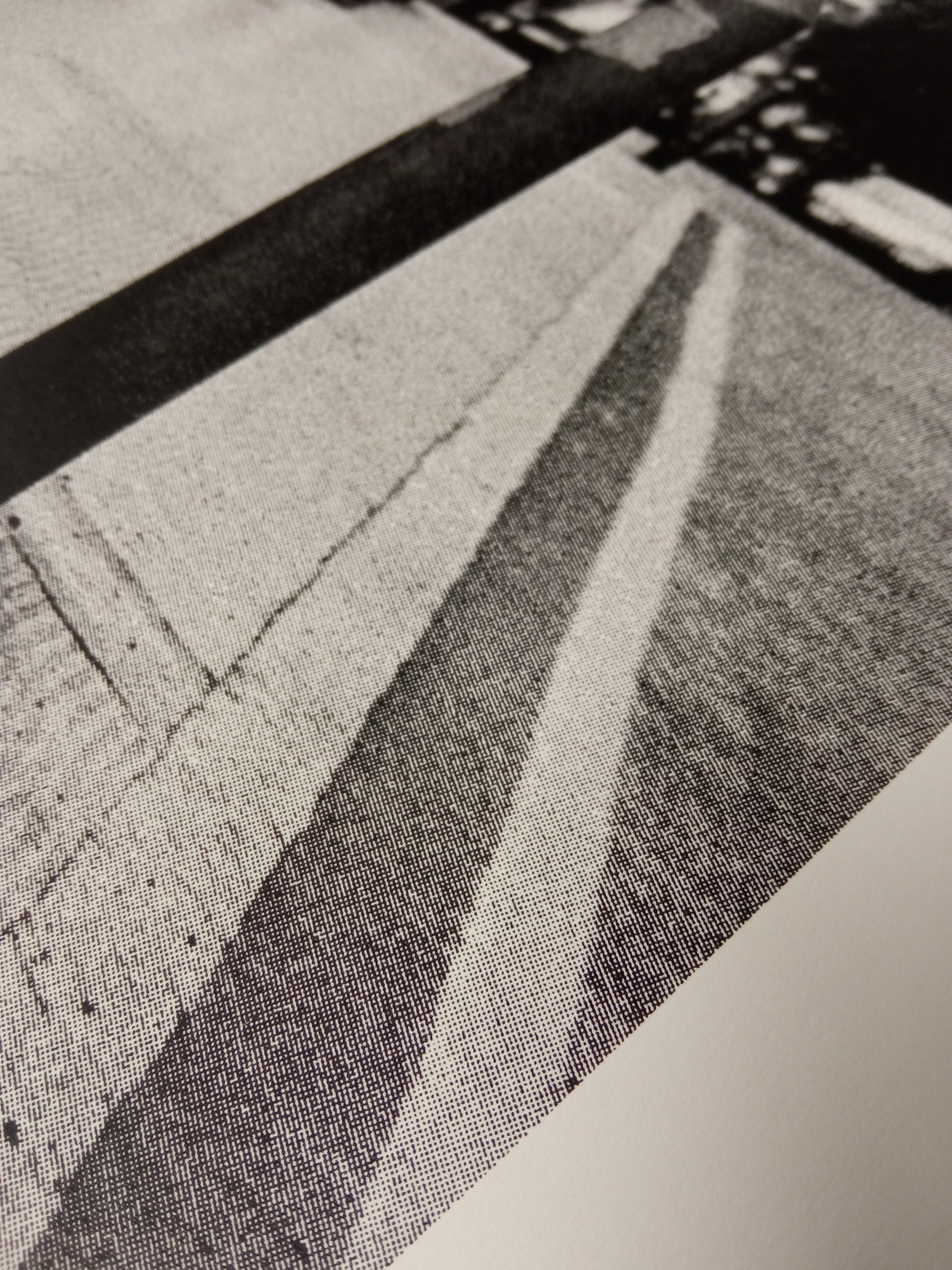 Utilisation de la trame en nuances de gris pour avoir un rendu photo et une profondeur grâce au noir intense de la sérigraphie.