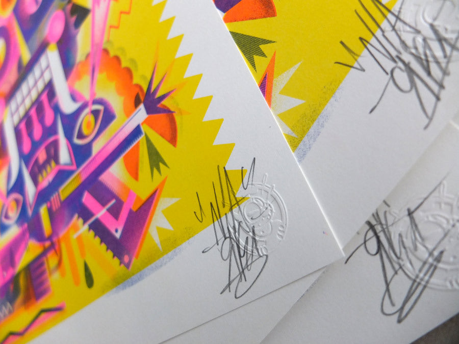 Tri-color riso print by the artist Niark1 / Munken Cream 240gr paper / Size A3 / 20 signed, embossed and numbered copies!