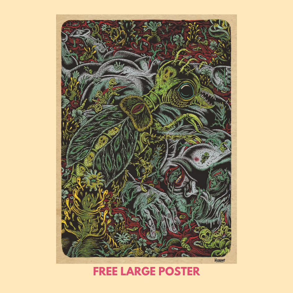 Véritable choc visuel, ce volume THE ART OF consacré à Stéphane Blanquet met en lumière la puissance évocatrice et la richesse graphique d’un artiste incontournable de l’art underground français. Son univers baroque, peuplé de figures métamorphosées et d’ombres symboliques, brouille les frontières entre dessin, art contemporain et hallucination visuelle.